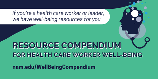 The National Academy of Medicine has launched a Resource Compendium for Health Care Worker Well-Being to access resources organized into 6 essential elements: advancing organizational commitment, strengthening leadership behaviors, conducting workplace assessments, examining policies and practices, enhancing workplace efficiency, and cultivating a culture of connection & support. Take steps now, wherever you and your organization are on the journey to improve health care worker well-being.